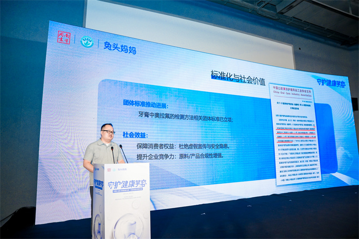 作为奥拉氟技术攻坚的企业代表,兔头妈妈已将部分成果转化为专利并面向行业公开共享。在自主研发过程中,兔头妈妈提出了关于奥拉氟含量的检测方法,并完成了国内首个奥拉氟原料标准品,用于检测对照,填补了现有检测技术的空白。会上,兔头妈妈口腔原料研发方向带头人单佳祺博士分享了该项工作的最新进展。他介绍,兔头妈妈已联合浙江省质量科学研究院、纳爱斯集团有限公司、黑龙江省轻工科学研究院等完成了牙膏中奥拉氟的检测方法相关团体标准立项。