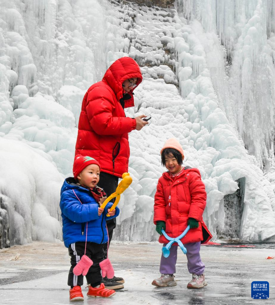 1月18日,人们在河北省承德市兴隆县青松岭镇石门台村附近的冰瀑游玩拍照。