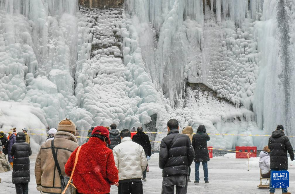 适逢周末,河北省承德市兴隆县青松岭镇石门台村附近的天然冰瀑景观吸引众多游客前来观赏游玩。