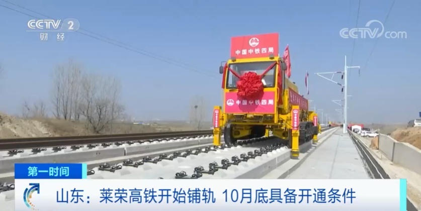 4月1日上午,在莱荣高铁施工现场,随着第一组500米长轨缓缓入槽,莱荣高铁正式进入全线铺轨阶段。线路起自青岛莱西市,终到荣成市,全线设7座车站,设计时速350公里,正线全长192.8公里。截至目前,全线桥梁、路基主体、隧道等工程已全部完成,线路预计10月底具备开通运营条件。