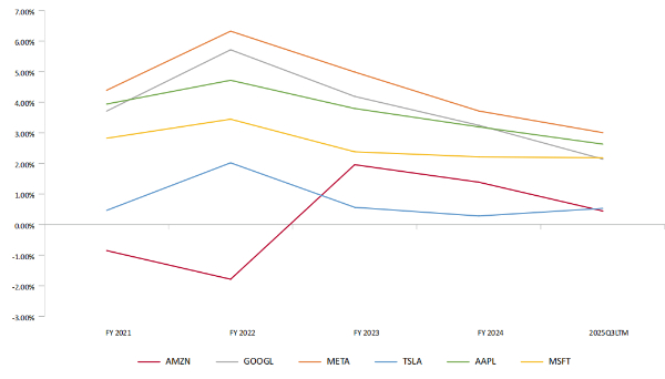 除英伟达外的科技巨头2021至2025年自由现金流收益率(FCF/EV)变化(单位:%)