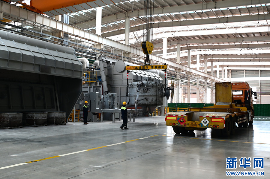 云南宏泰新型材料有限公司生产的电解铝液运抵云南创格新材料科技有限公司生产车间(6月13日摄)。新华网发(刘起 摄)