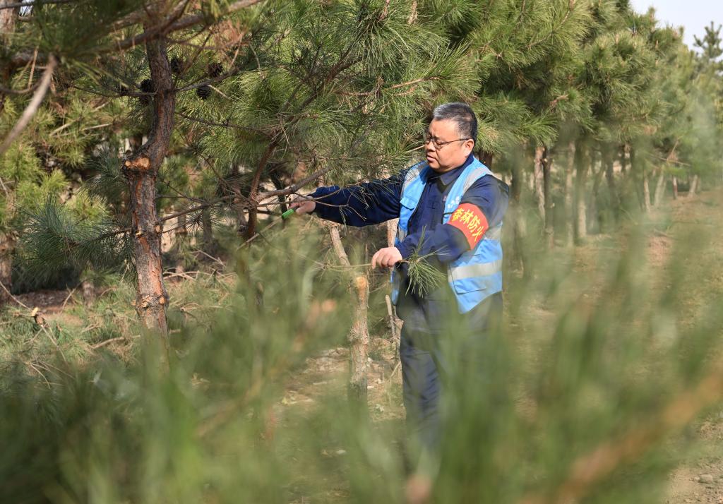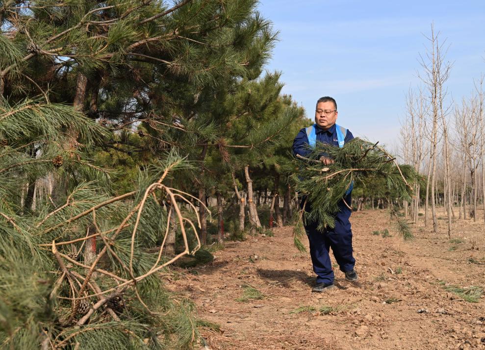 3月19日,刘世光在雄安新区“千年秀林”雄中片区的树林里修剪树枝。
