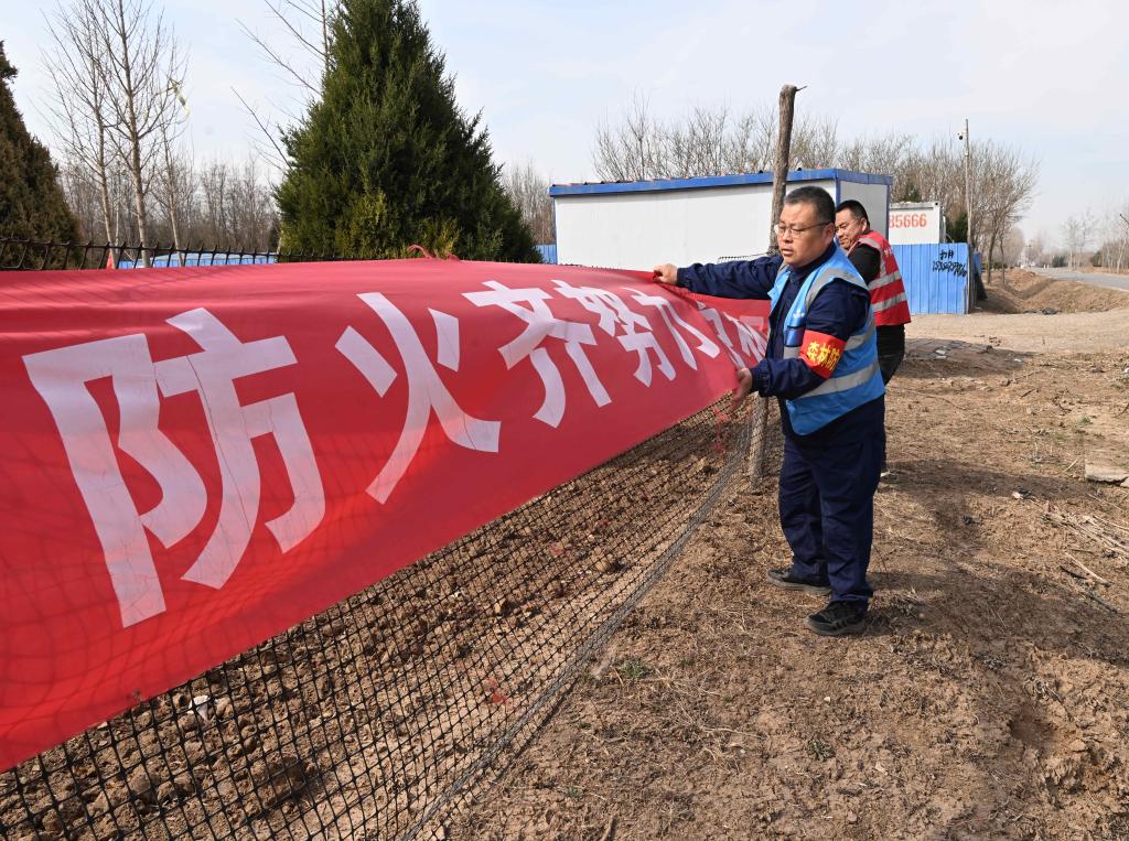 3月19日,刘世光(前)在雄安新区“千年秀林”雄中片区悬挂防火宣传横幅。
