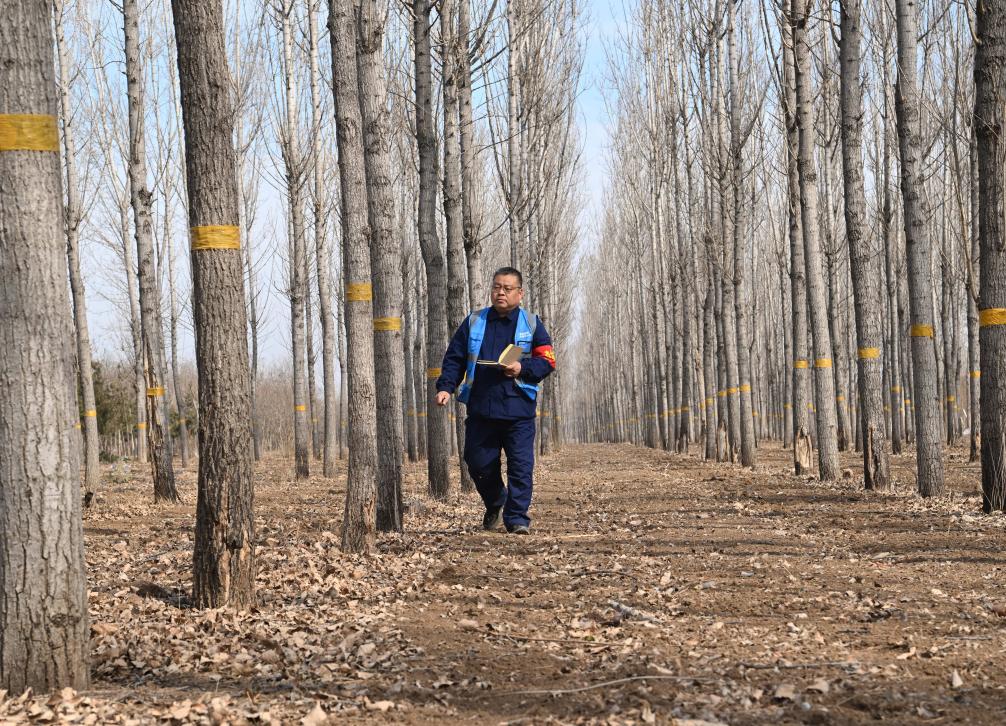 3月19日,刘世光在雄安新区“千年秀林”雄中片区的树林里查看病虫害情况。