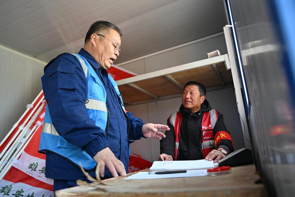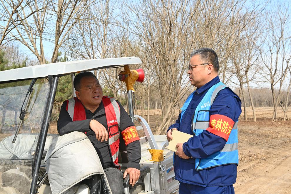 3月19日,刘世光(左)在雄安新区“千年秀林”雄中片区防火检查站与护林网格员交流。