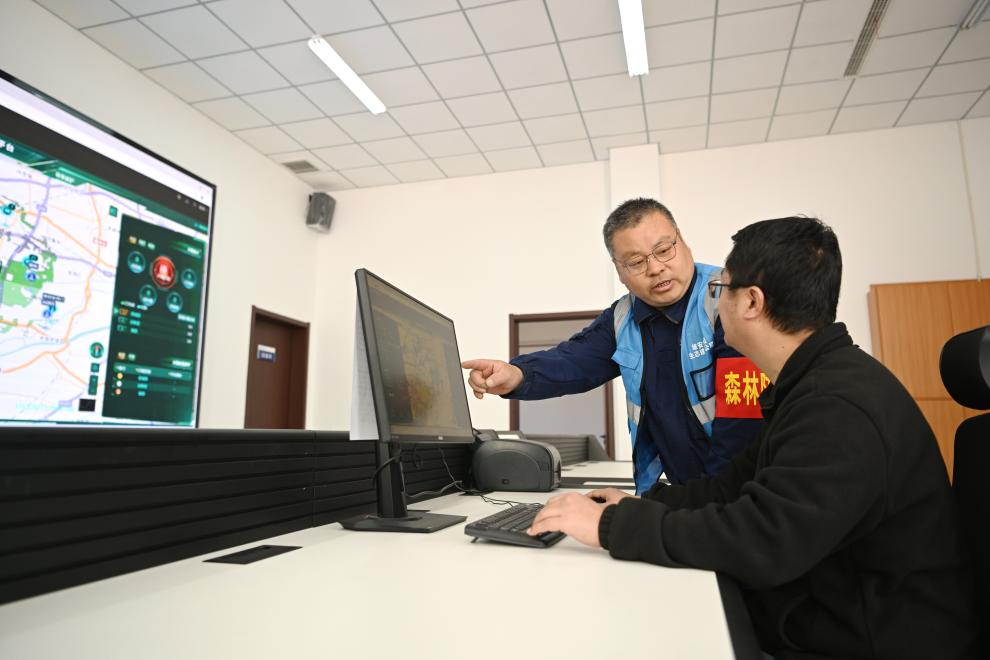 3月19日,刘世光(左)在雄安新区“千年秀林”雄中片区管护调度室与工作人员交流巡检工作。