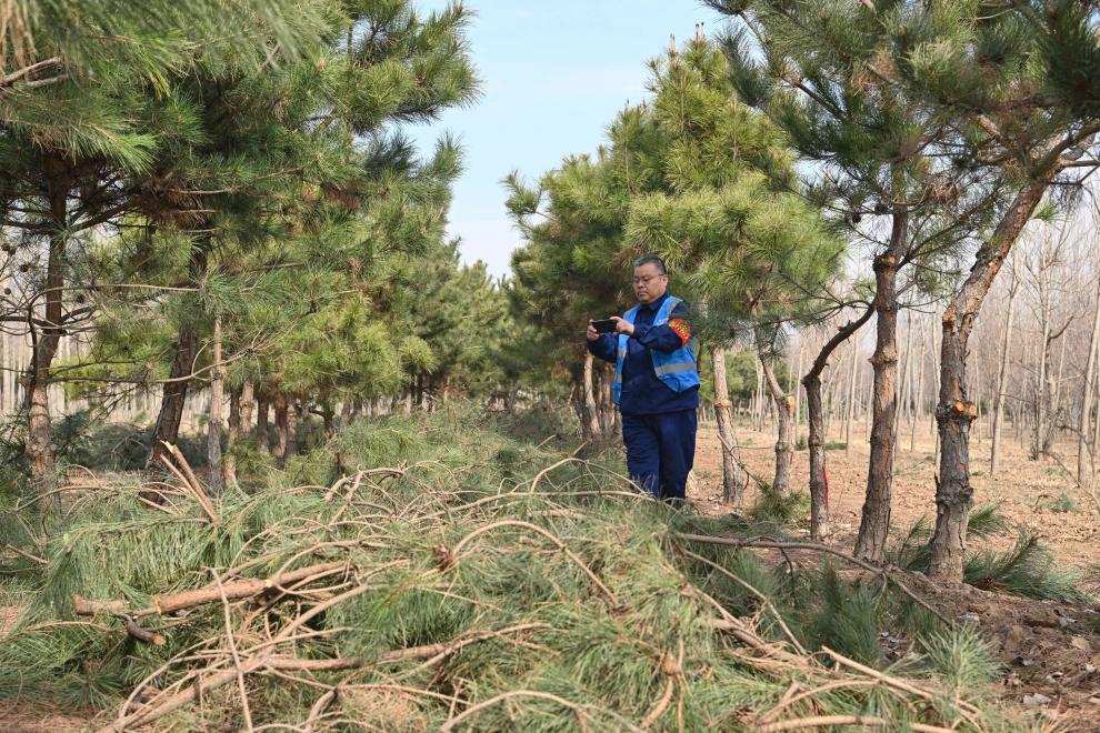 3月19日,刘世光在雄安新区“千年秀林”雄中片区的树林里拍摄巡检现场。