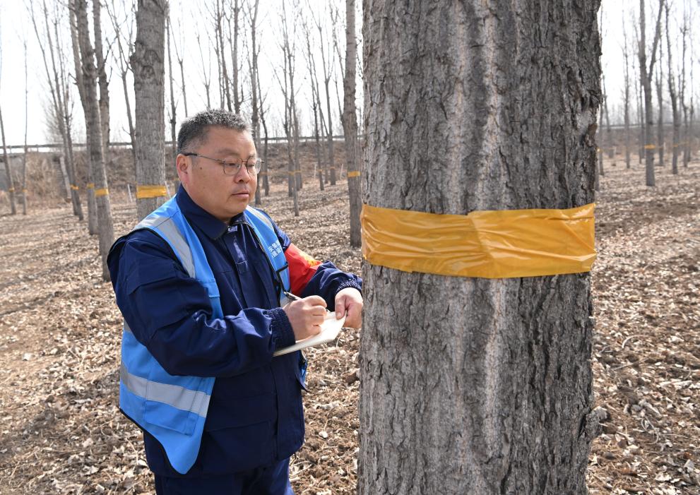 3月19日,刘世光在雄安新区“千年秀林”雄中片区的树林里测量树木生长量。