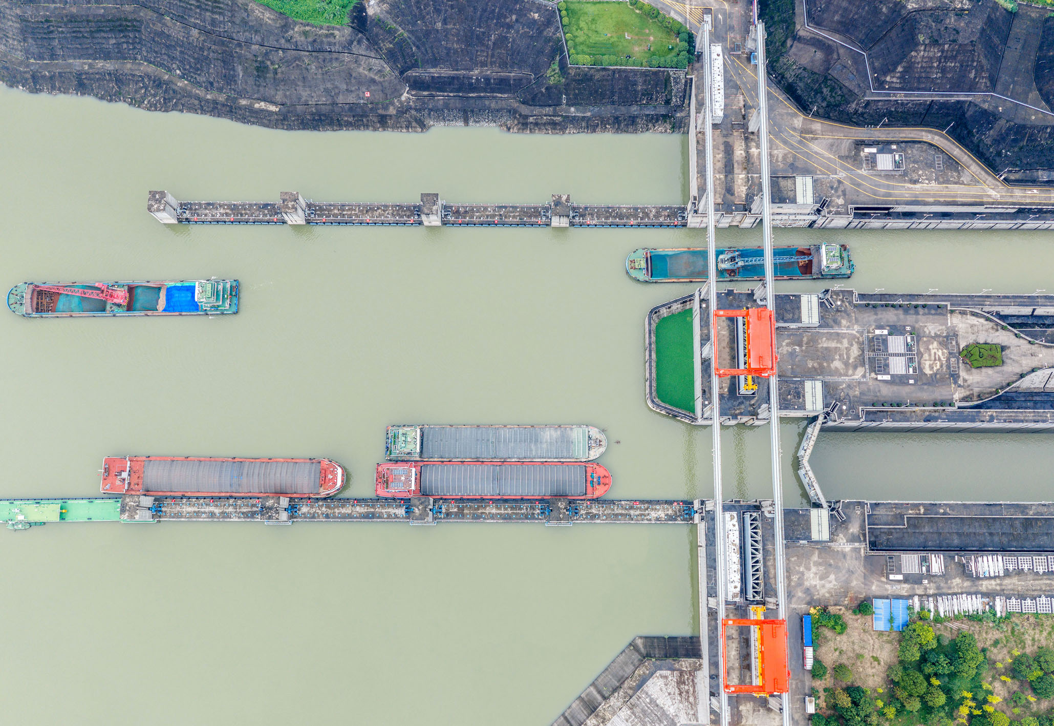 在湖北省宜昌市,船舶有序通过三峡双线五级船闸(无人机照片)。新华社发(王罡 摄)