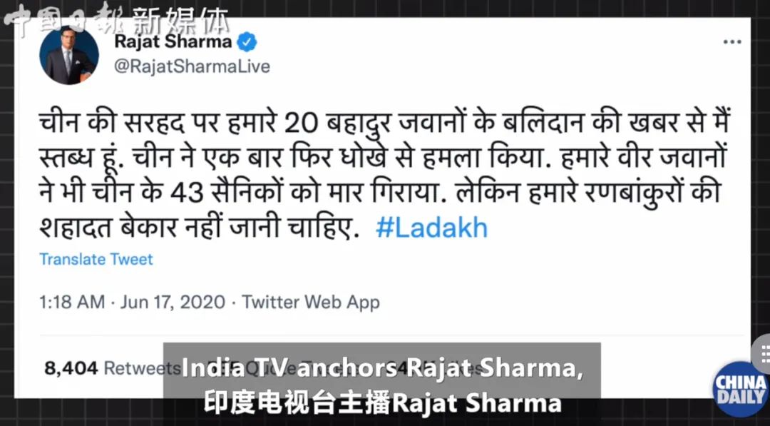 印度电视台主播Rajat Sharma同样扭曲了冲突事件的真实性