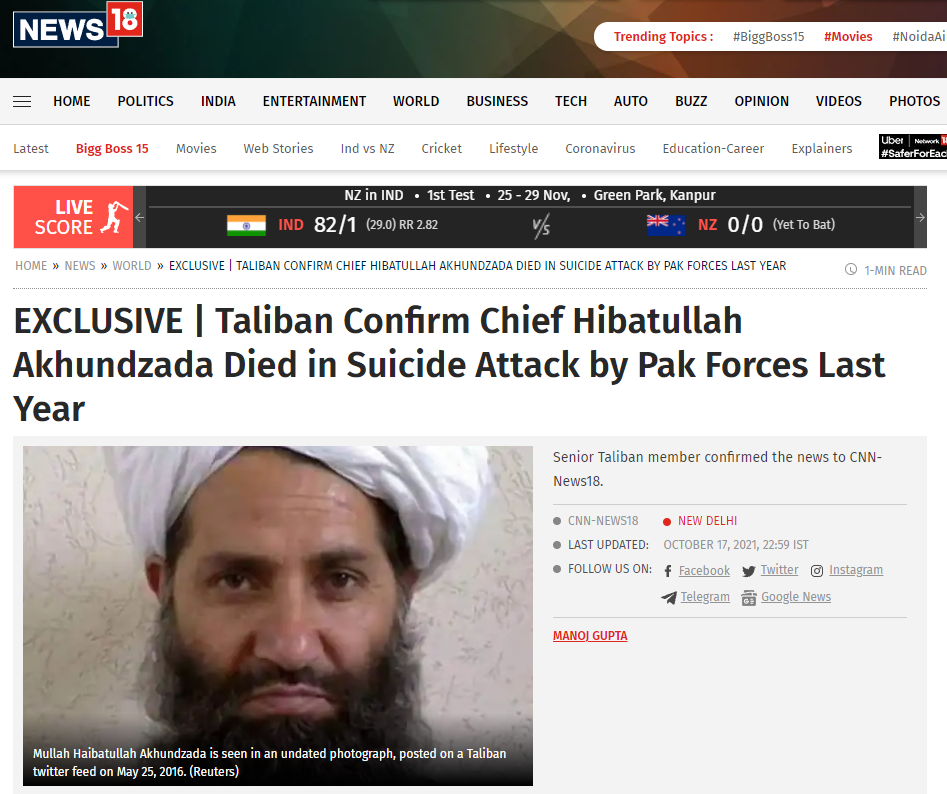 上个月,CNN-News18发布在其官网上的一则“独家报道”称阿富汗塔利班重要领导人阿洪扎达