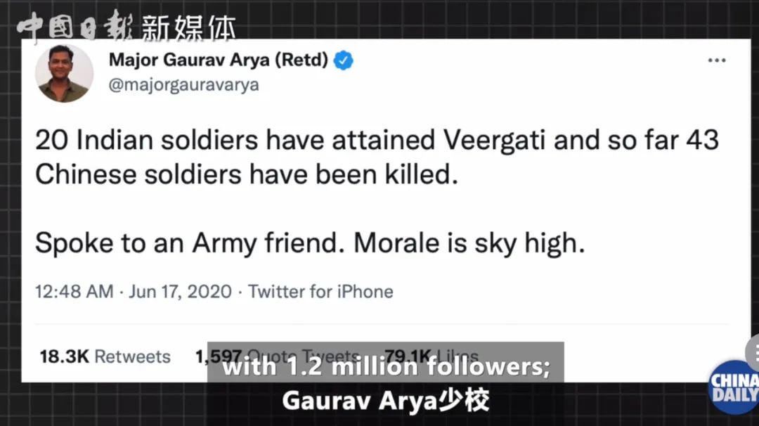 中国日报记者经过调查发现,“43名中国解放军阵亡”的假新闻开始流传的时间点,是印方报道20名士兵在冲突中死亡后不久。