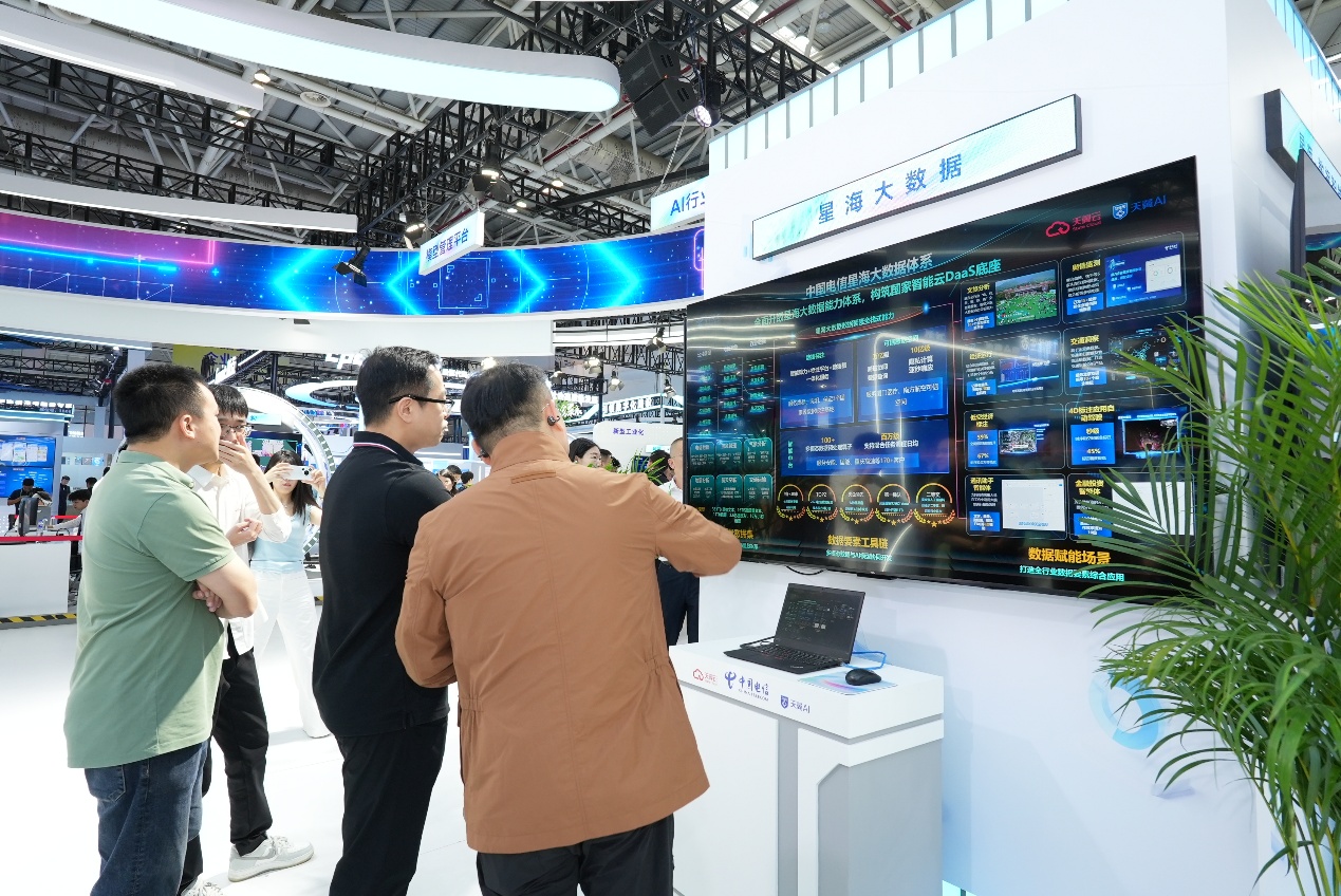 走进星海大数据展区,星海数据智能中台、星海数据标注、星海可信数据空间等核心板块聚焦数据流通与价值释放,展现中国电信在数据要素领域的强大实力。其中,星海数据智能中台通过多模态数据治理与AI算法辅助实现数据的高效智能化运营,在智慧城市、工业互联网等场景中助力企业实现精准决策、降本增效。