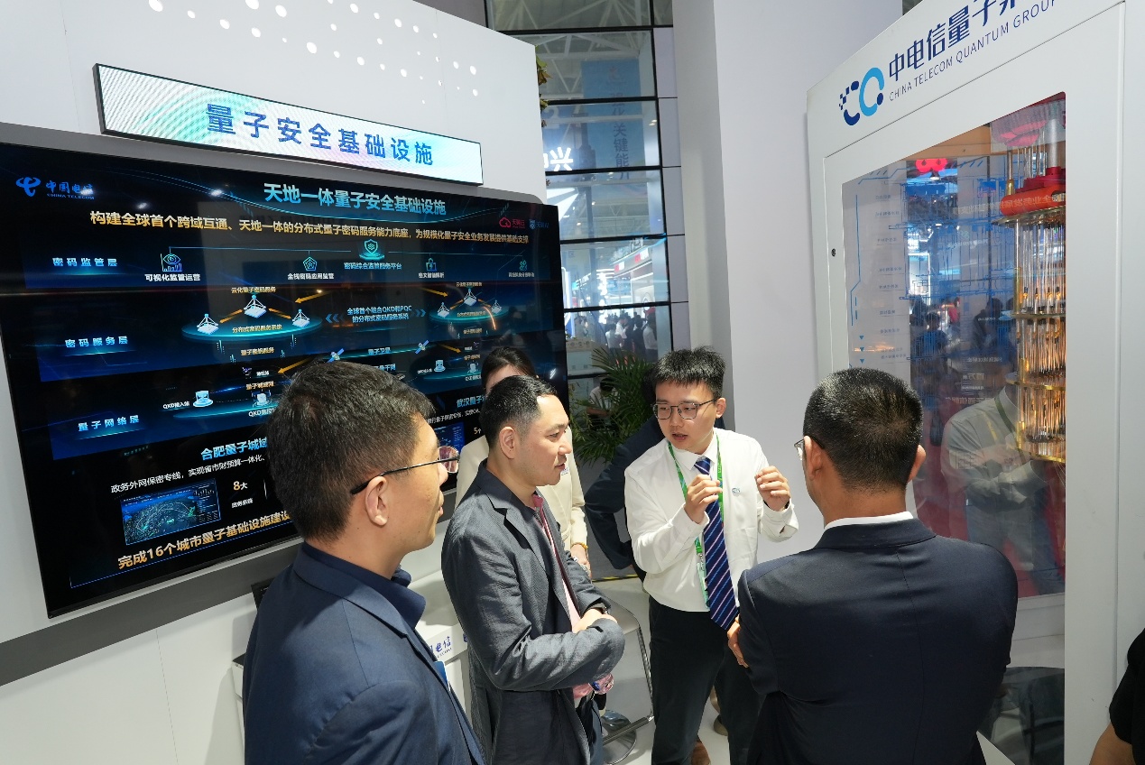 在量子科技展区,“天衍”量子计算云平台、量子密信、量子密话、量子云印章、量子密改等一系列量子科技安全产品,吸引了大量观众驻足观看。目前,中国电信已建成具备“量子优越性”的超量融合云平台“天衍”,和超导量子算力集群。其中“天衍”平台成功入选“2024年央企十大国之重器”。