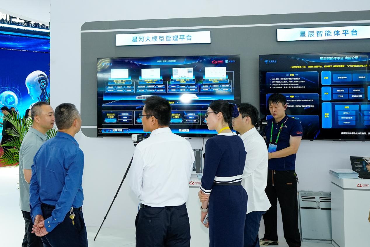 在人工智能展区,中国电信展示了其从基础设施到开发应用平台,再到场景化应用的全栈AI能力。最新升级的AI基础设施底座——星河平台和智能体平台,全面支撑AI规模发展。星河平台实现全模态模型纳管、全链路模型训推,极大提高模型场景适用率。升级后的智能体平台支持多模式灵活开发、低门槛闭环调优、多渠道发布和运营,全方位满足企业AI应用落地需求。