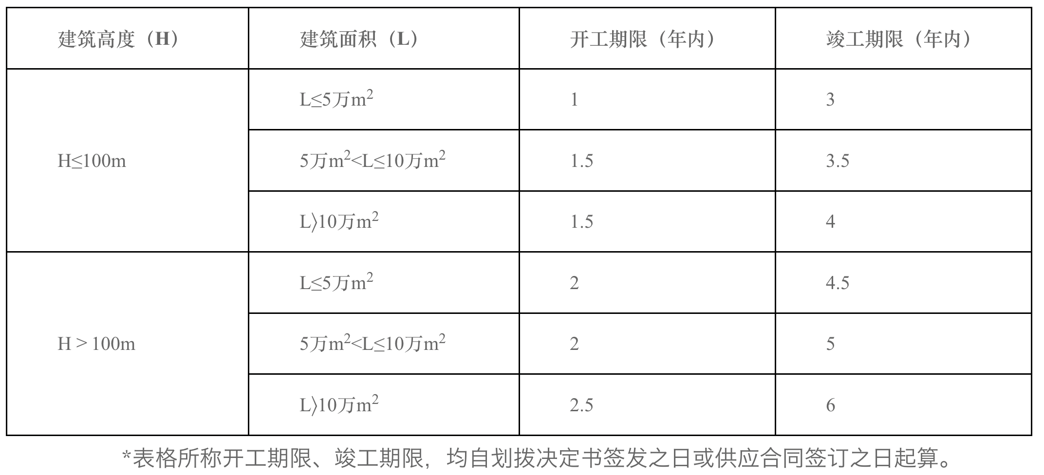 《办法》根据项目用地性质、建筑高度和建筑规模的不同,对建设用地的开工、竣工期限作出规定。(一)主体功能为住房类建设项目应在划拨决定书签发之日或供应合同签订之日起1年内开工建设,自划拨决定书签发之日或供应合同签订之日起4年内竣工。(二)主体功能为非住房类建设项目的开工、竣工期限按下表规则确定。其中,建设项目地下室≥3层的,其开工日期可再延长6个月,竣工期限相应顺延。