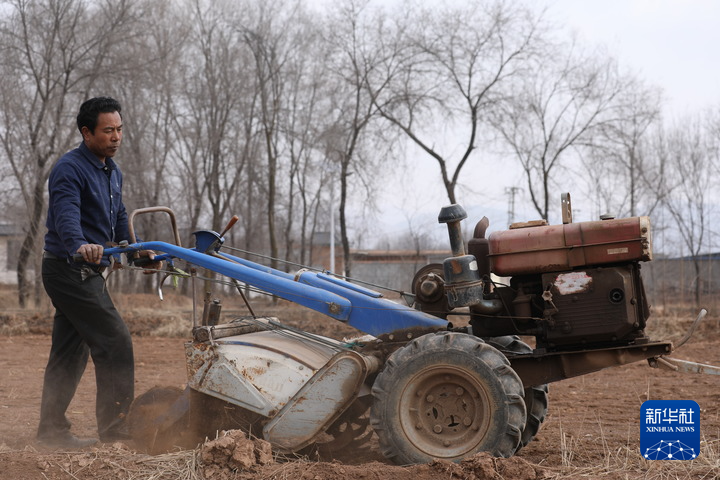 2月19日,在青海省海东市民和回族土族自治县中川乡光明村,村民操作农机在田间耕种。新华社记者周盛盛 摄