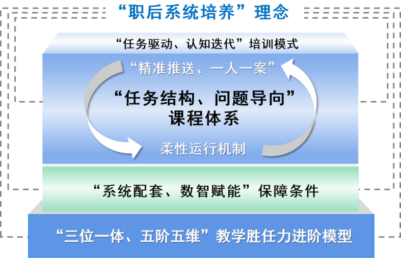 该体系针对传统教师培训存在的碎片化等问题,提出“职后系统培养”新理念,让老师们“入职”即“入学”,边从事教学工作,边上一个“职后培养专业”,将教师培养体系视为一个“专业”进行系统建设。