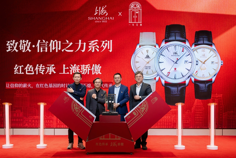据介绍,此次联名款腕表以“致敬·信仰之力”为主题,包含“红星相映款”“A623复刻款”“旗帜飘扬款”三款腕表。系列作品深度融合“上海制造”与“红色文化”,将中共一大纪念馆的建筑意象、红色故事与上海表经典的海派制表工艺凝练于腕间。