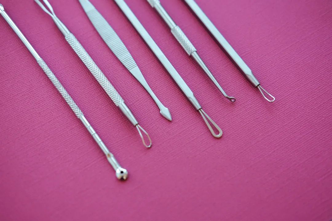 ③挑选对的工具。如果是挤粉刺,那么可以选择靠近皮肤表层的、最好有开口的来下手。这时比较适合用工具,比如说干净、没有生锈、消毒后的粉刺针。