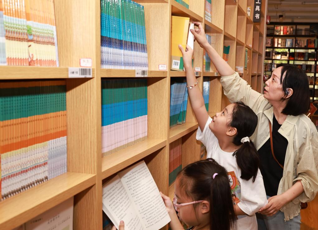 在武汉新华书店水果湖书店内,家长带着孩子选购学习辅助书籍。新华社发(赵军 摄)