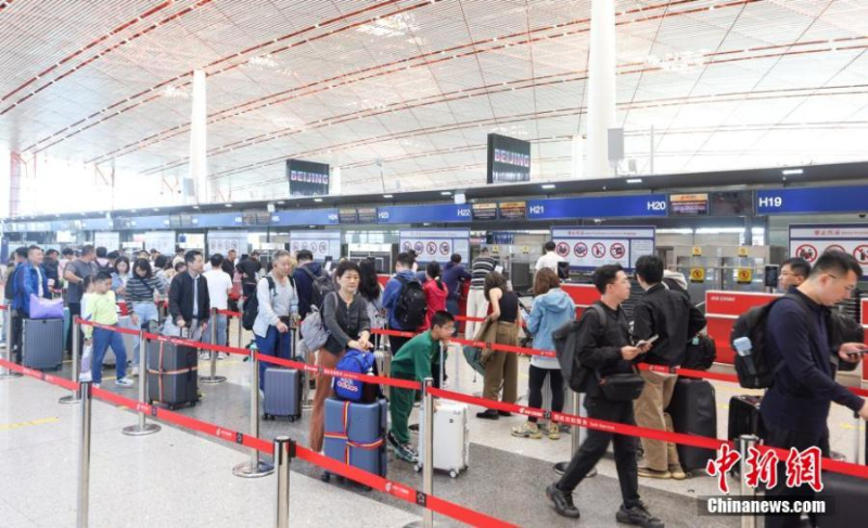 资料图:旅客在北京首都国际机场排队办理值机手续。 中新社记者 贾天勇 摄