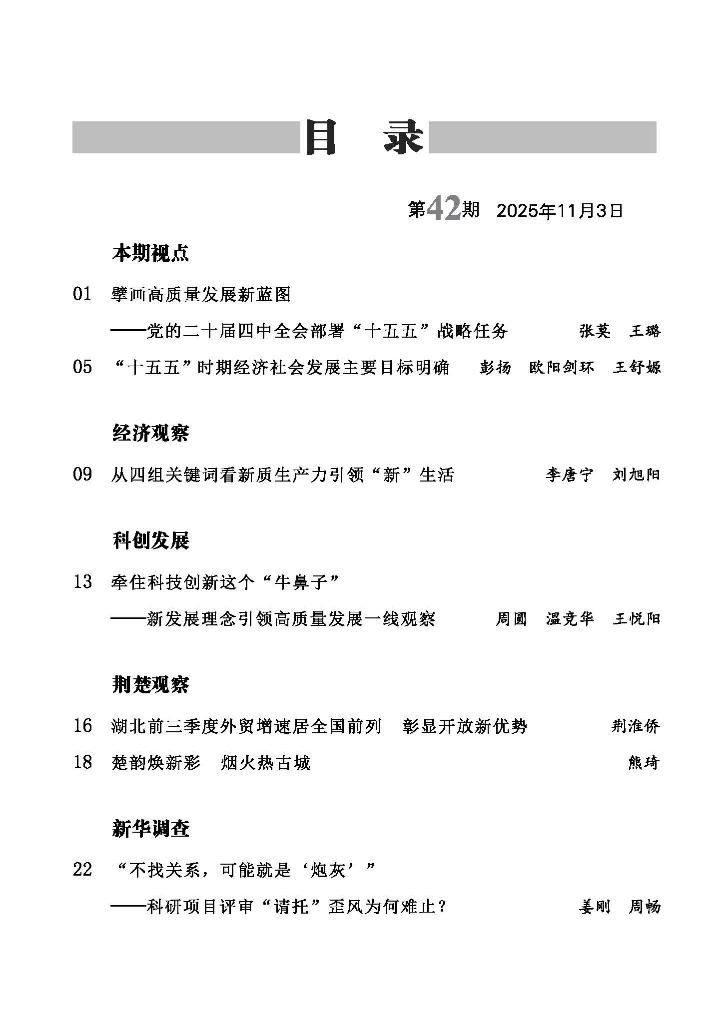 (4)本期【荆楚观察】推出《湖北前三季度外贸增速居全国前列 彰显开放新优势》《楚韵焕新彩 烟火热古城》两篇文章,共同呈现了湖北在外贸与文旅领域双向发力、开放创新推动高质量发展的新态势。文章指出,在外部环境挑战下,湖北省2025年前三季度外贸表现强劲,进出口总值同比增长25.3%,增速位居全国前列。这一成绩得益于鄂州花湖国际机场新通道的高效运转及其带动的市场扩容,以及以机电产品、新能源等为代表的新质生产力的驱动。与此同时,荆州市通过举办楚文化节、打造沉浸式文旅场景、升级古城街区等创新举措,成功将历史文化与现代体验融合,国庆期间游客量与旅游收入大幅增长,展现出文旅融合对区域发展的显著带动作用。