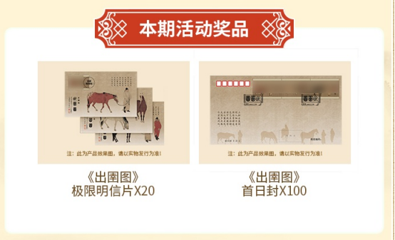 本次邮票数字化活动继续奖品大放送,中国邮政准备了《出圉图》极限明信片和《出圉图》首日封等丰富奖品赠送。