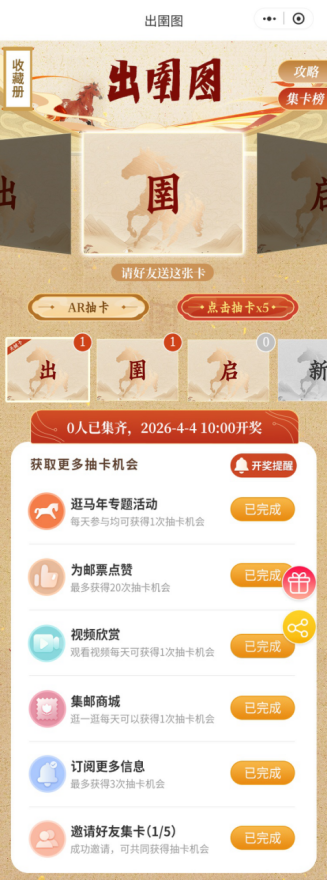 该套邮票将在全国指定邮政网点、集邮网厅、中国邮政手机客户端、中国邮政微邮局集邮微信商城和中国邮政商城微信小程序出售,出售期限为6个月。为了更丰富地展现邮票内容,中国邮政将通过“中国集邮邮票百科”微信小程序发布数字化内容,可使用AR功能观看。参与完成“逛马年专题活动”“订阅更多消息”“邀请好友集卡”“为邮票点赞”和“视频欣赏”等任务,能获取更多抽卡机会,和小伙伴互换卡片,一起更快集齐赢取奖品吧。