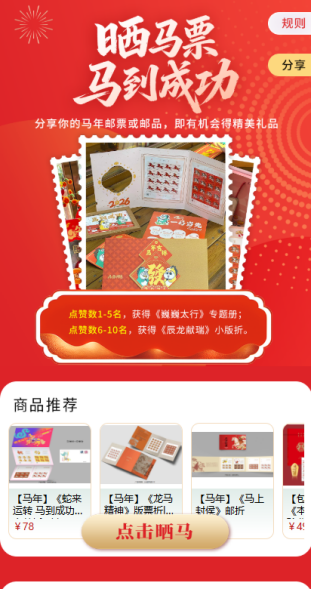 参与“晒马票 马到成功”话题互动,用户分享购买的马年邮票或邮品,点赞前10名可获得精美礼品,包括《巍巍太行》专题册或《辰龙献瑞》小版折。