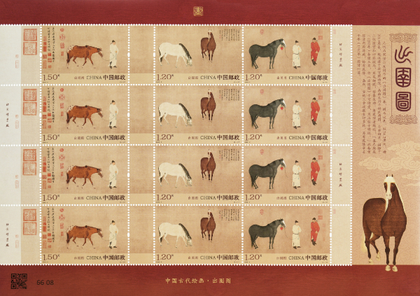 该套邮票在版面构成上,采用古画题材常用的连票设计,以“全出血”的表现方式,加大古画图案面积;采用与古画底图尽量接近的淡赭色细边框,衬以红棕色的面值和图名,与邮票铭记共同置于版面下方,更好地衬托原画古韵、还原古画原貌。在画面处理上,对人物、马匹、印章、文字、绢质底纹等进行分层刻画处理,同时适当提高色彩饱和度;底图采用古画常用的赭黄色调,精准展现古画的色彩层次和墨色的细微变化,色彩雅致协调、层次细腻丰富。邮票大版设计以中国传统的暖棕、朱砂、米黄为边框色调,色彩过渡自然柔和,衬托出原画古朴典雅的独特韵味。右侧昂首的骏马与邮票主题元素相互呼应,强化主题的同时突出视觉焦点。该设计将元代宫廷绘画的笔墨神韵与历史质感精准传递,营造出沉静、厚重的文化氛围,让观者能直观感受古画的艺术张力。