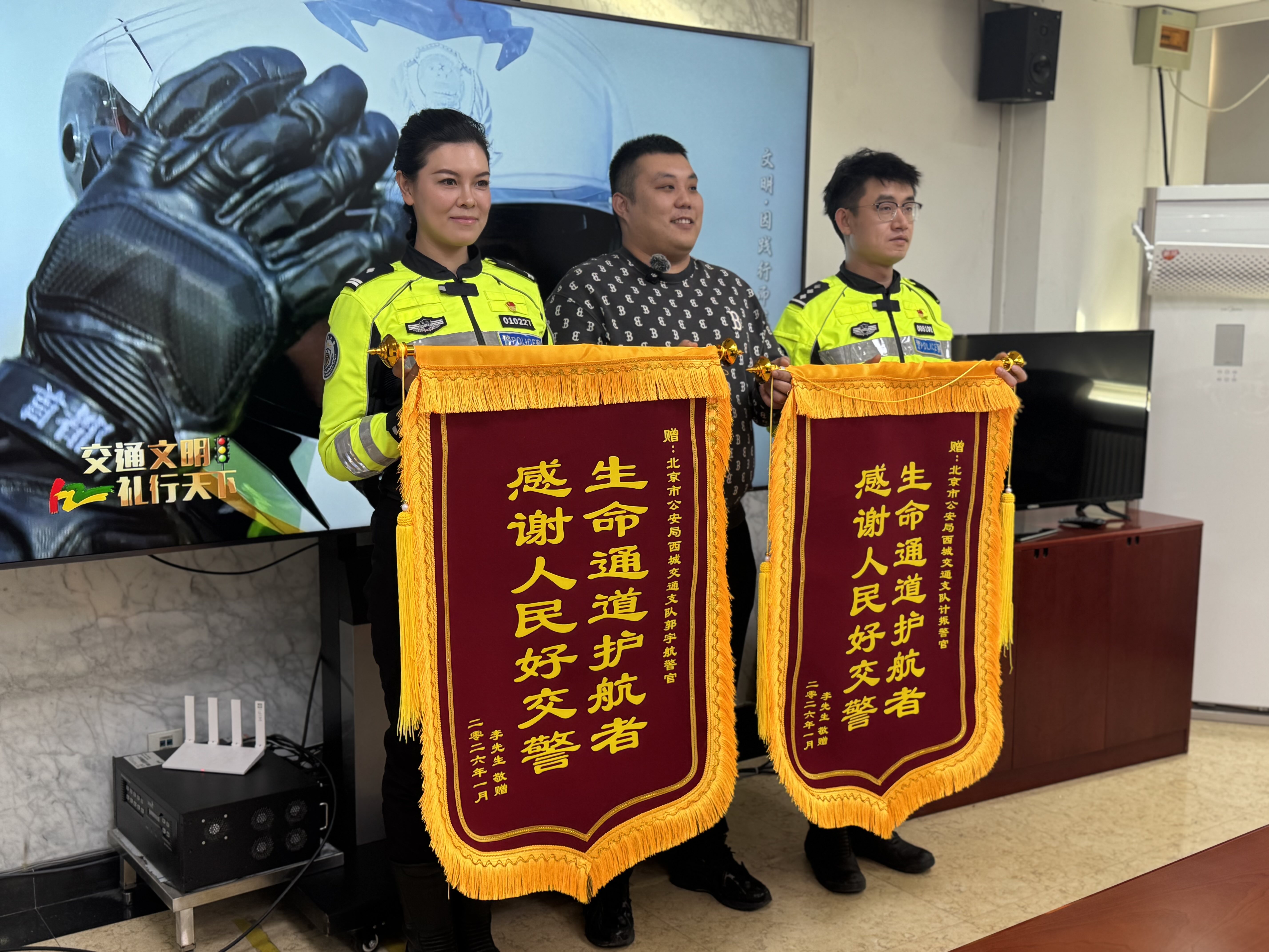 直到今年1月16日,李腾在外就餐时,偶然刷到《平安北京》节目中交警郭宇航的报道——画面中讲述的,正是八个月前那场紧急护送。他这才得知恩人的姓名与单位。欣喜之余,李腾特意定制锦旗,于22日亲自送到支队,了却这桩萦绕心头已久的心愿。