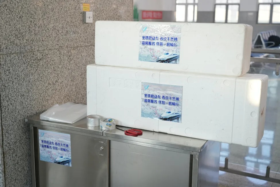 根据冻鱼的不同外形,铁路部门为旅客准备了两种尺寸的包装箱,每个包装箱内配有保温材料,确保冻鱼在长途运输中不会化冻漏水。