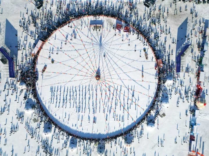 1月8日,在吉林省松原市,人们参加吉林·查干湖第24届冰雪渔猎文化旅游节开幕式(无人机照片)。新华社记者 颜麟蕴 摄