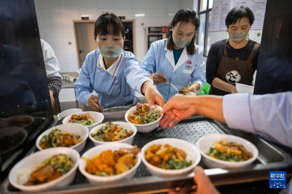 10月14日,在孝昌县王店镇松鹤仁养老院,护工为老人准备晚饭。新华社记者 伍志尊 摄