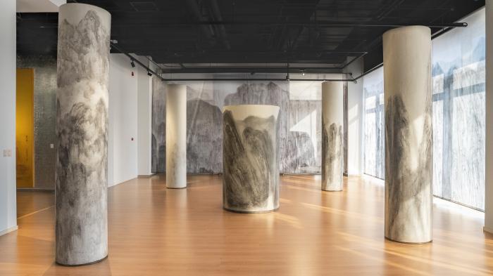 展览现场,近百件作品在现代展厅中铺陈开来,彻底改变了传统案头观赏的方式。从悬置天顶的《天元》到长达二十六米的弧形长卷《若出其中》《若出其里》,作品以巨大的体量主动介入建筑空间,引导观众调整观看距离与仰角,在物理与心理层面形成双重震撼,构建出浑然天成的“鸿蒙之境”,让艺术精神与科技理性深度交融,为科创高地增添了温润的文化温度,真正实现了“笔墨融科技,山水入新境”的美学探索。