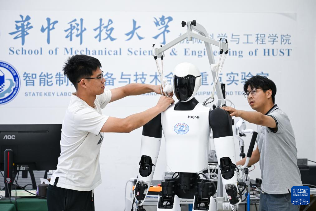 5月29日,在华中科技大学机械科学与工程学院,博士研究生丁涛(右)与博士研究生林宇辰放置“荆楚”人形机器人。新华社记者 杜子璇 摄