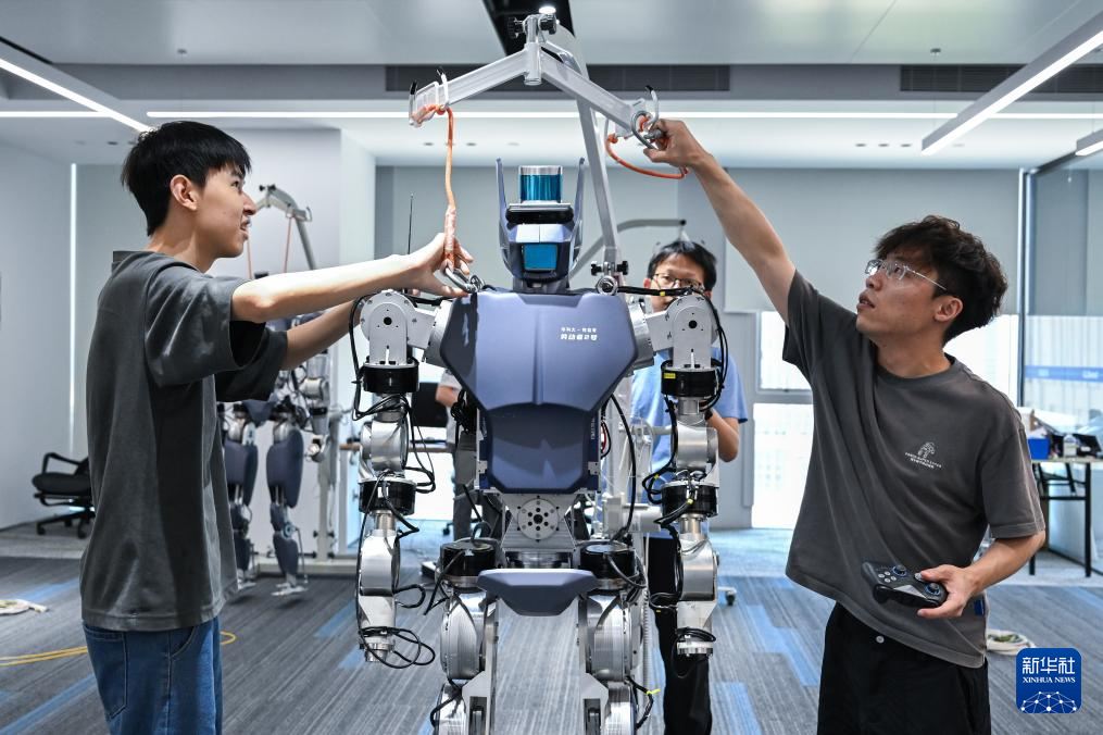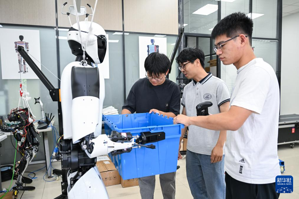 6月30日,在武汉格蓝若智能技术股份有限公司,华中科技大学博士研究生钱乐天(右一)和团队成员准备对“劳动者”系列人形机器人进行调试。新华社记者 杜子璇 摄
