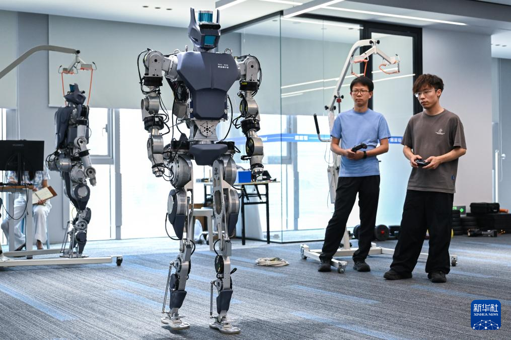 6月30日,在武汉格蓝若智能技术股份有限公司,华中科技大学博士研究生钱乐天(右)对“劳动者”系列人形机器人进行平地全向行走测试。新华社记者 杜子璇 摄