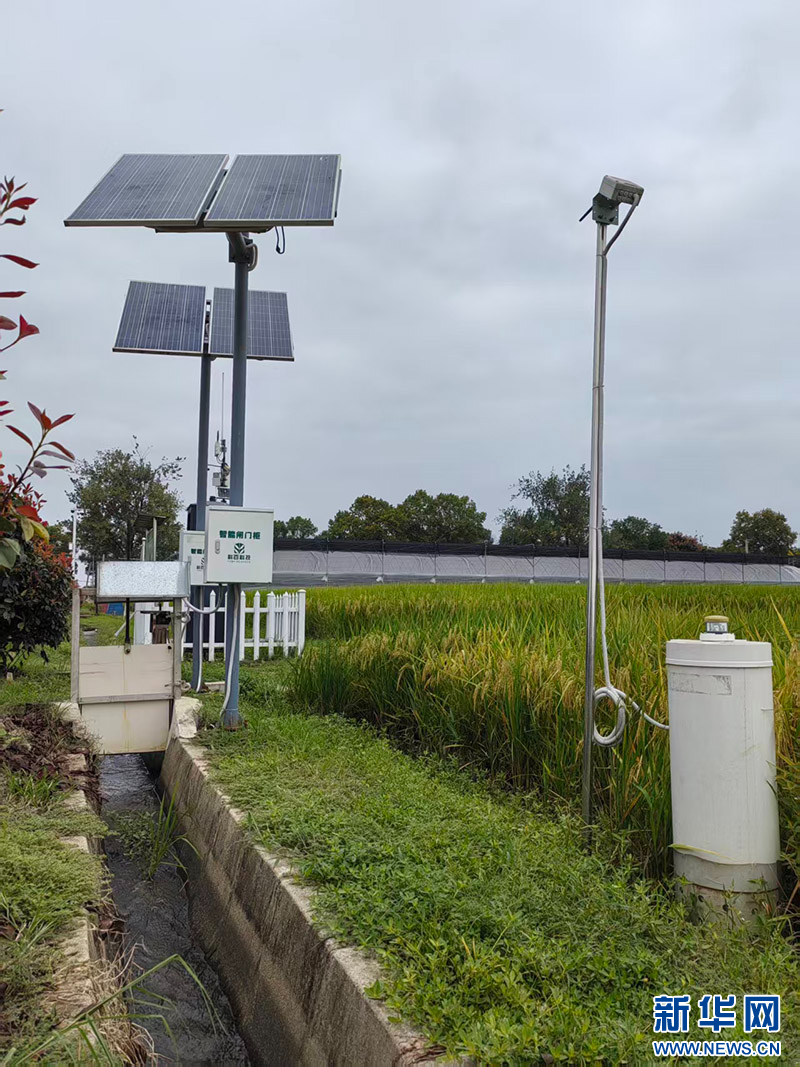 稻田边,灌溉渠里的水缓缓流过,巡田人员打开渠边智能闸门柜,启动开关,闸门自动降下,闸门柜上方有用来供电的太阳能光伏板。