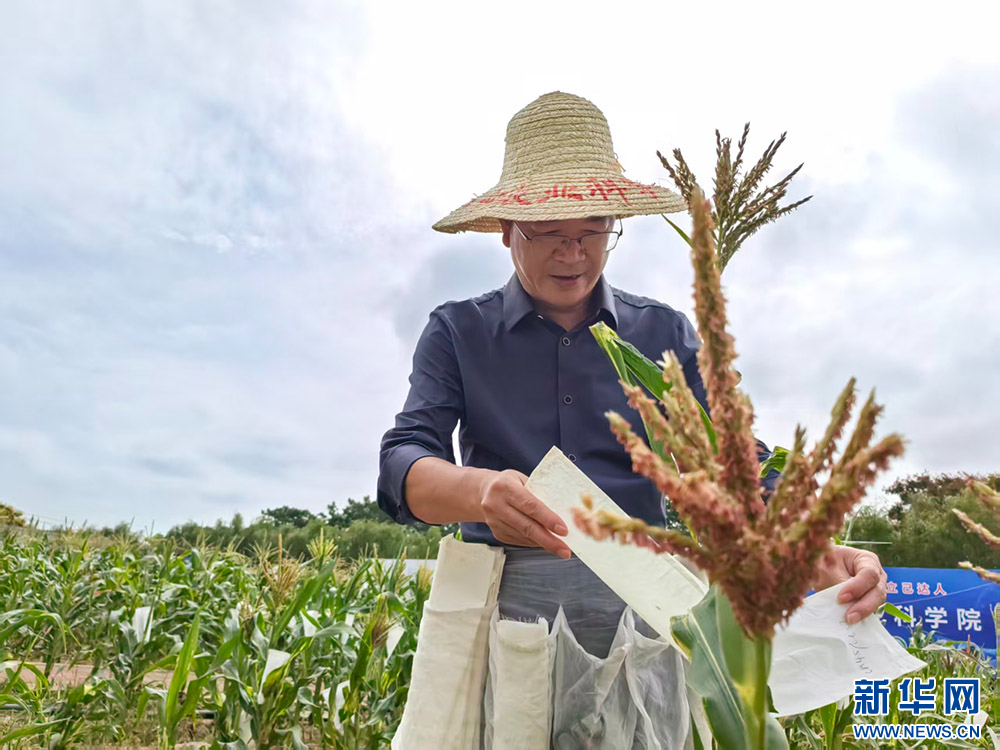 9月26日,在武汉市农业科学院北部园区实验基地,高级农艺师徐长城给玉米做杂交授粉。新华网刘晓丽摄
