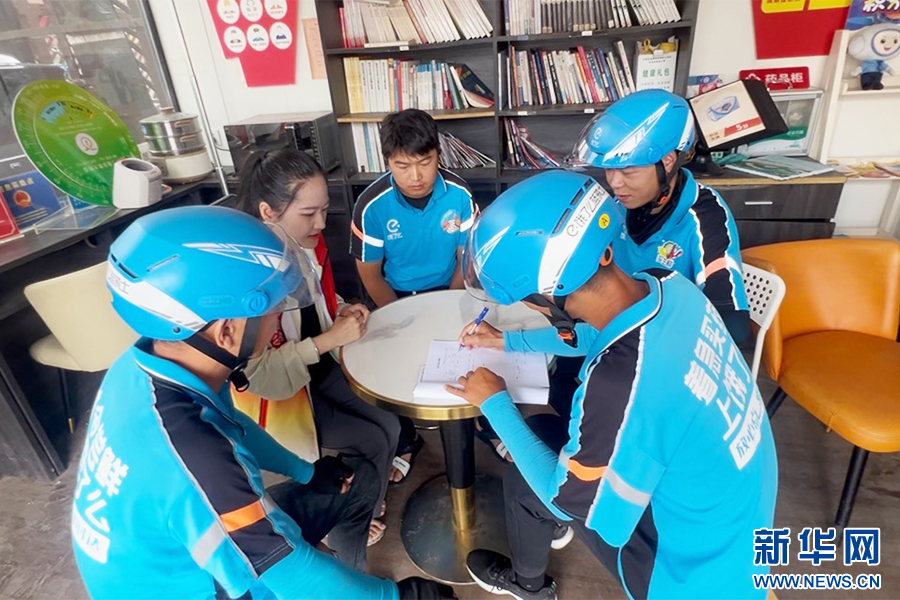 图为春晓社会工作服务中心社工为骑手建立服务档案。新华网发