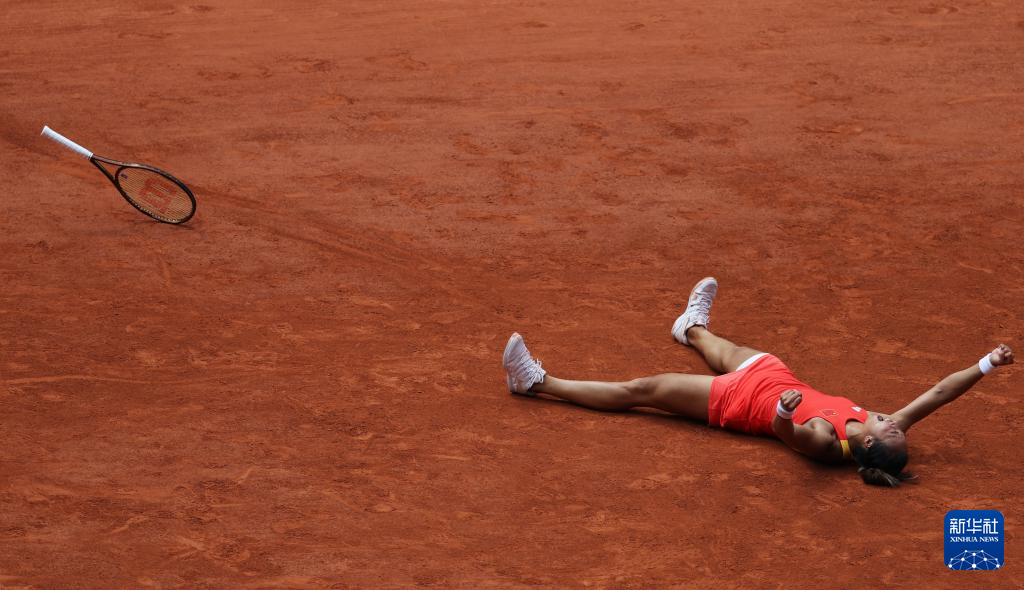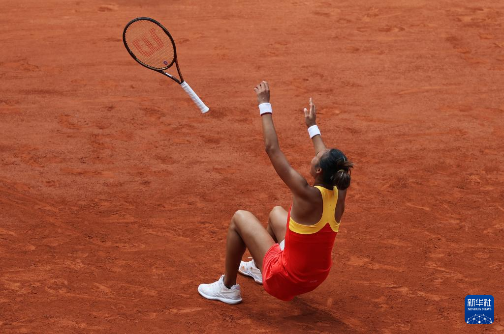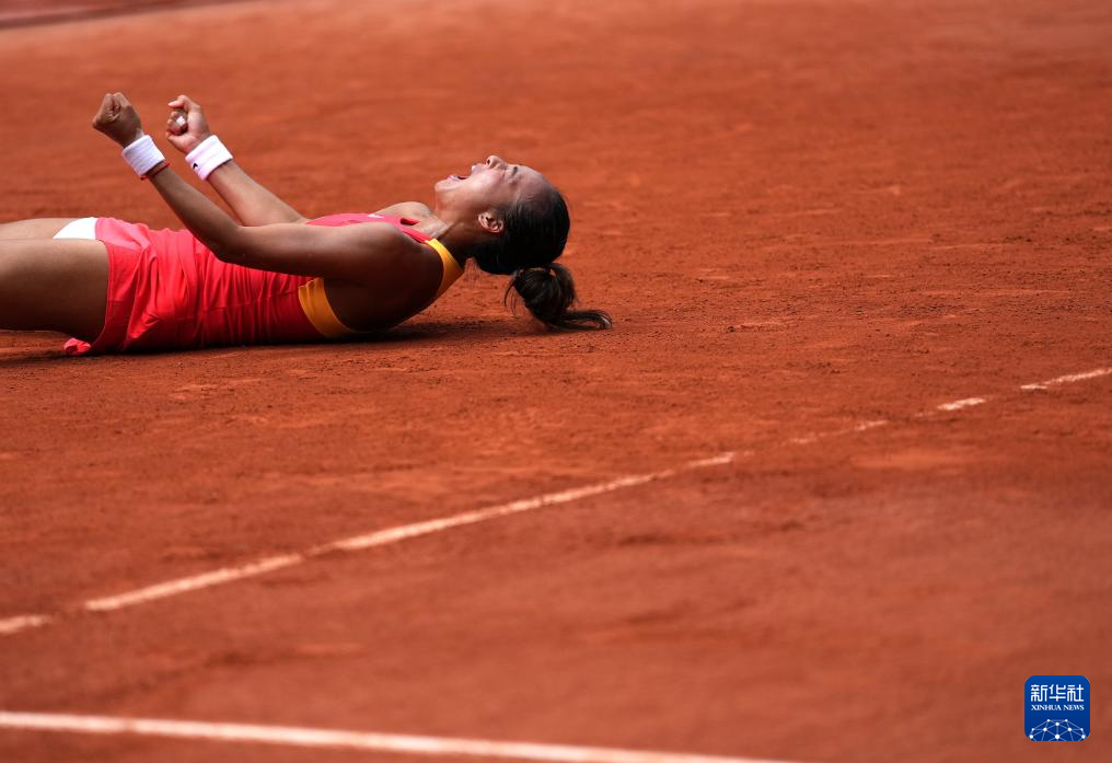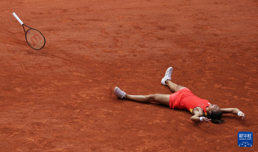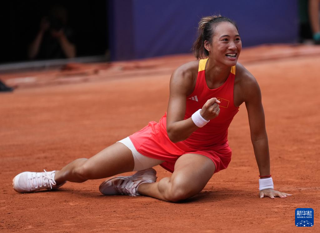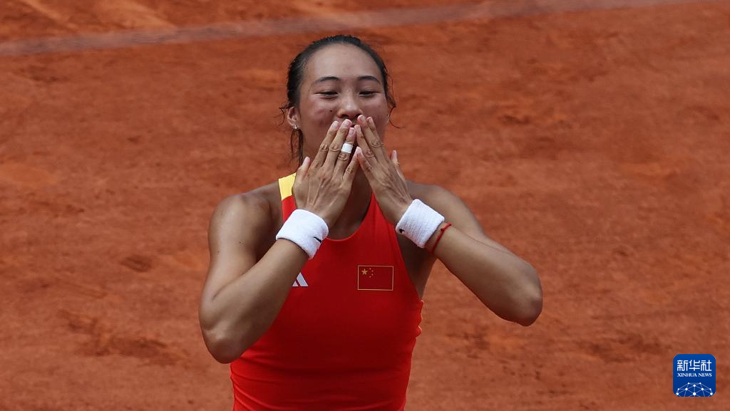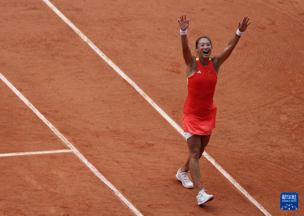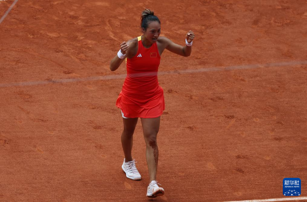 8月1日,中国选手郑钦文庆祝胜利。新华社记者 万象 摄