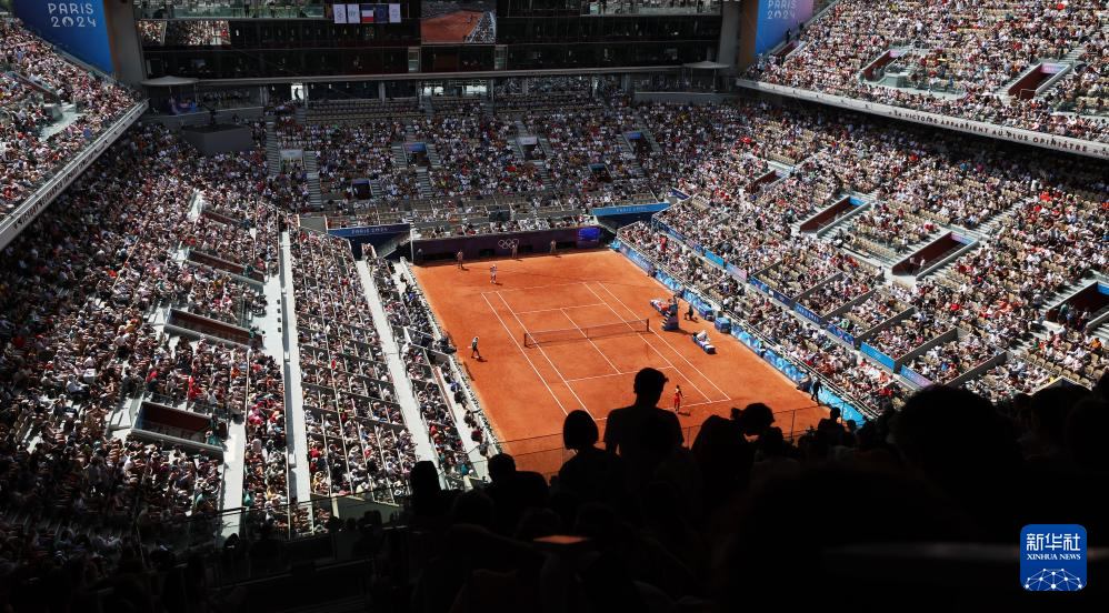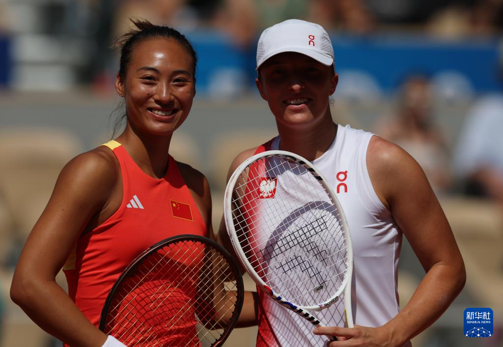 8月1日拍摄的中国选手郑钦文和波兰选手斯维亚特克比赛现场。新华社记者 高静 摄