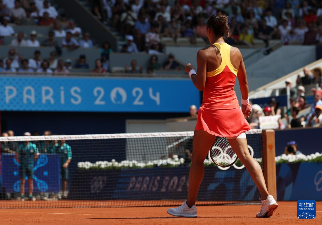 8月1日,中国选手郑钦文庆祝胜利。新华社记者 高静 摄