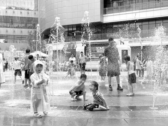 18时,望京SOHO音乐喷泉准时开启。伴随着优美的音乐声,数支喷泉水柱随着音乐的起伏高低变化,水、雾、光影交融在一起,阵阵凉意沁人心脾。喷泉池边,不少小朋友带着小水桶、水枪,在水池外围舀水嬉戏。有家长带着孩子赤脚走进水池中踏浪,还有小朋友干脆整个人坐在水池中感受清凉,这可急坏了一旁的安保人员。