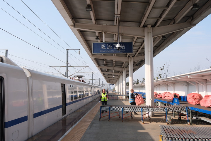 走进成都双流西站候车大厅,不见传统的座椅与安检口,取而代之的是货物传送设备,鲜花等货物在传送带上平稳流转。