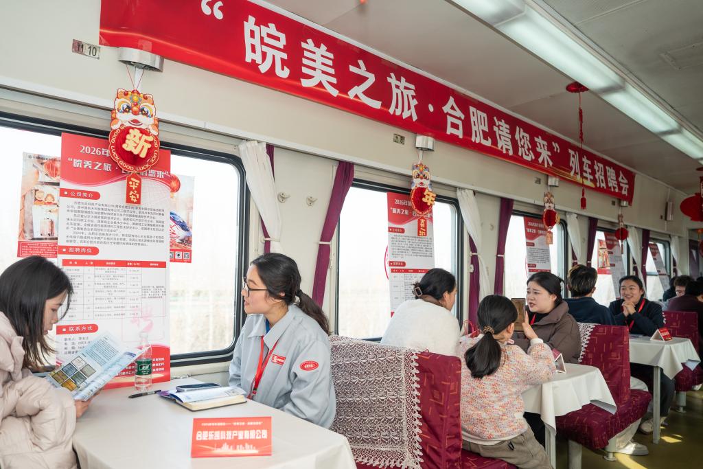 当日,由中国铁路上海局集团有限公司合肥客运段联合合肥市人力资源与社会保障局举办的列车招聘会在上海站开往阜阳站的K8362次列车上举行,为返乡游子架起就业对接的桥梁。