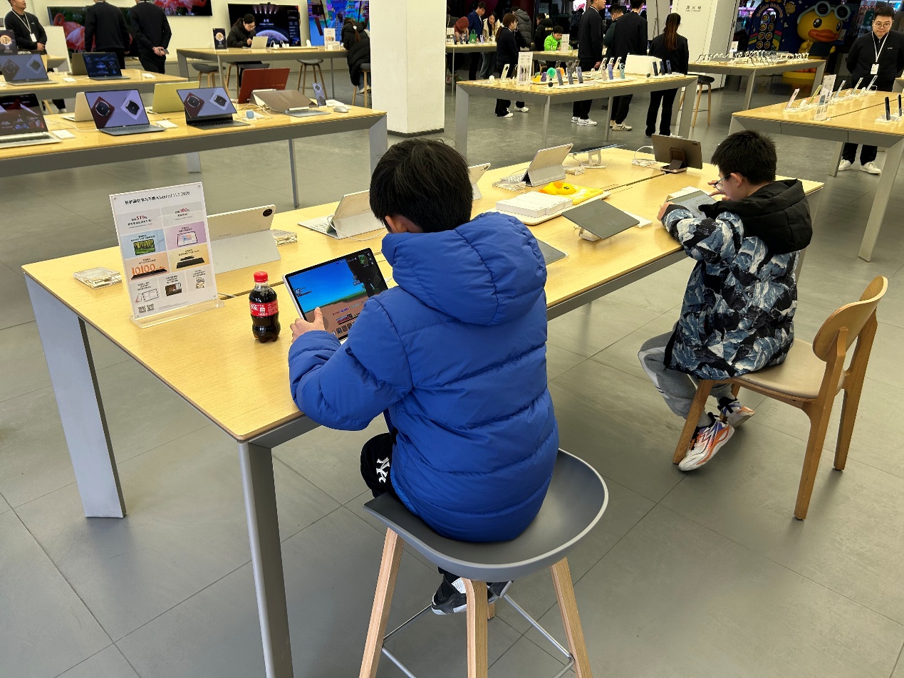 “工作日的孩子还算少的,等到周末,全都是小孩。”一位店员说道。等到记者周六下午再次来到这里,发现孩子的数量确实比前一天只多不少,尤其是在平板电脑区,几乎每一台样机都已“名花有主”,有的孩子看起来只有四五岁,也在平板上熟练地玩着游戏。